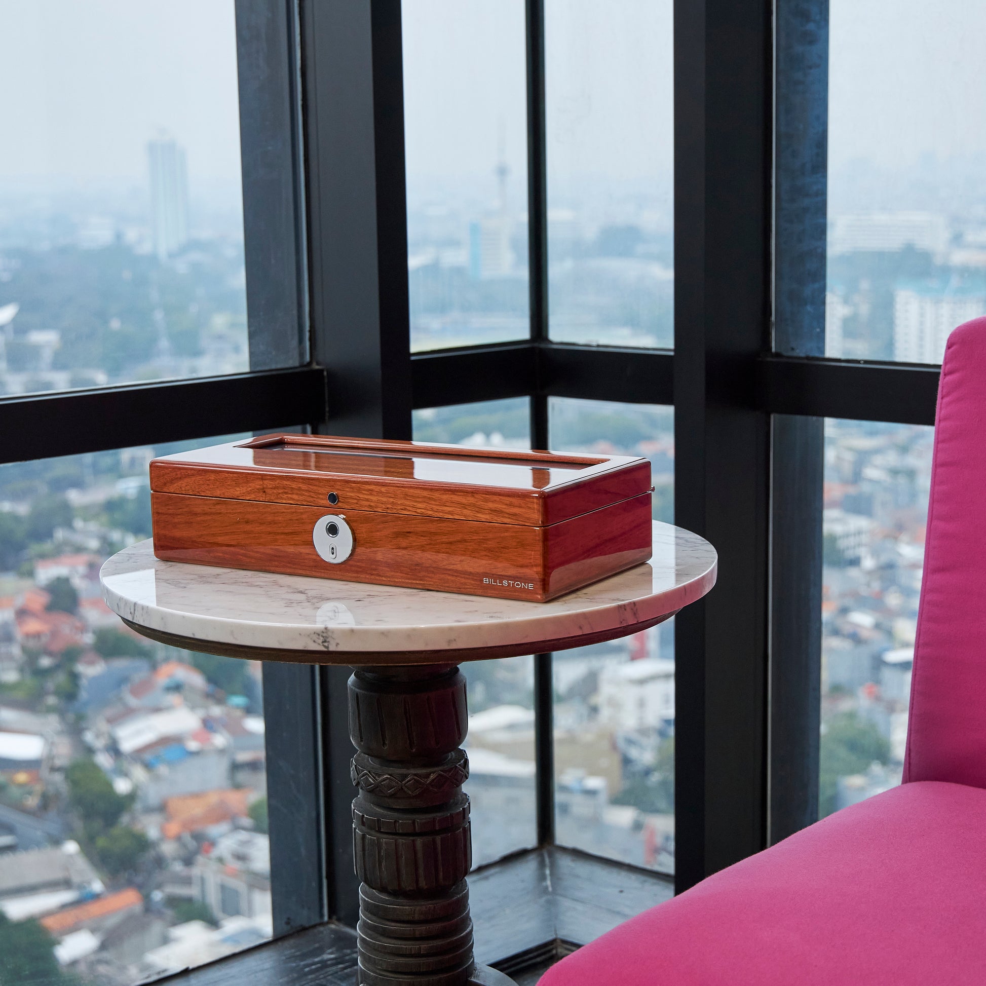 The Jarwique Fingerprint 12 made in fine mahoqny wood and features a fingerprint lock system.